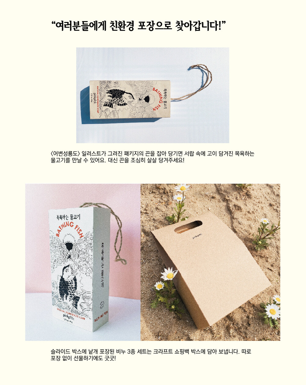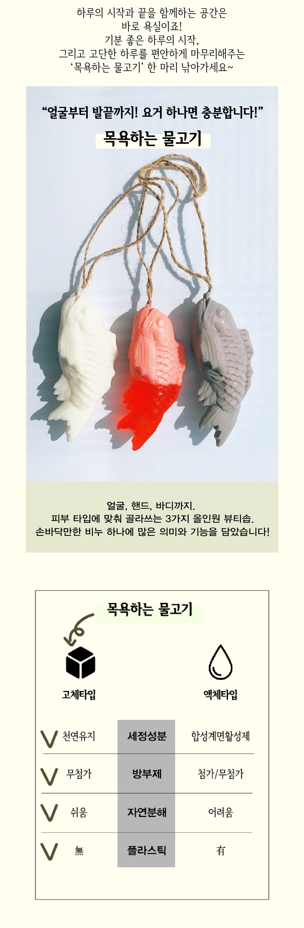 당신의 피부 맞춤 비누, [목욕하는 물고기]로 우리의 삶은 아름답게 선순환됩니다. 자연을 사랑하는 마음까지 눌러 담은 장인정신이 빛나는 수제 비누로 여러분의 일상을 재충전하세요!